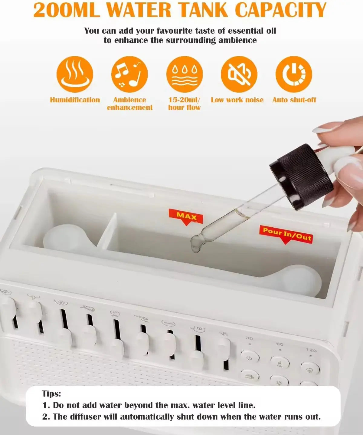 Transform your bedroom into a peaceful retreat with this all-in-one relaxation device. Designed to help you sleep better, breathe easier, and relax faster, it combines white noise technology, aromatherapy, and soothing ambient lighting — the ultimate solution for light sleepers and noisy environments.